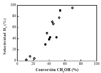 Se observa que la selectividad a H 2 aumenta conforme lo hace la conversión de metanol, alcanzando selectividad prácticamente total para conversiones próximas al 80%.