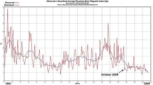 Como muchos lectores regulares lo saben, yo hice notar repetidas veces el incidente de un abrupto y sostenido bajón en el Índice Ap solar que ocurrió en Octubre 2005. A mi me pareció que el abrupto cambio de paso estaba fuera de lugar con la información, y el hecho de que el sol parece haberse reestablecido en una meseta más baja del índice Ap después de ese evento y no se ha recuperado aún es una anomalía que merece investigarse.