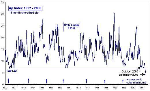 La última vez que el Índice Ap estuvo tan bajo fue en 1933. El valor de 2 del Ap de Diciembre 2008, publicado ayer por el SWPC, jamás ha sido tan bajo. Más aún, la tendencia desde Octubre 2005 continúa declinando después de haber estado en una notoria meseta durante dos años. El año pasado comenzó nuevamente a disminuir.