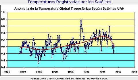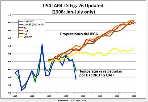 Los modelos matemáticos que tanto admira el redactor de El Mundo, predecían que el calentamiento global sería sostenido y casi lineal, en un ascenso constante hacia la catástrofe. Ni uno solo de los 20 o 30 más famosos modelos matemáticos del clima predijo o “proyectó” (como les gusta decir ahora, que “ellos no predicen sino que proyectan escenarios posibles”, como curándose en salud), una detención de la tendencia ascendente después de 1998, una tendencia plana hasta 2007, y una pronunciada bajada de las temperaturas desde entonces. La “asombrosa fidelidad” de los modelos sólo existe en la imaginación afiebrada de los “calentones.” Se muestran abajo algunas de sus profecías (perdón, proyecciones) y, por favor, compárese con la realidad del gráfico que le sigue.
