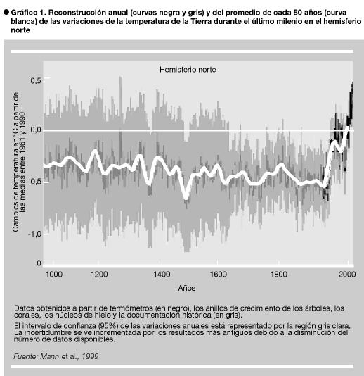 En los últimos años ha habido un gran avance en nuestra comprensión de la evolución «global» de los cambios de temperatura del aire durante los últimos 10 siglos. Uno de los estudios de referencia es el de Mann y otros (1999), que recogemos en el gráfico 1, obtenido gracias a la combinación de datos de temperaturas derivadas del estudio de los anillos de los árboles, testigos de hielo, corales y documentos históricos, además de termómetros de los últimos 140 años (véanse otros en http://www.ngdc.noaa.gov/paleo/recons.html). Parece bastante evidente que las temperaturas del siglo XX en el hemisferio norte han sido las más elevadas de los últimos 1.000 años, lo que hace que la década de los noventa sea la más cálida de todas, y que 1998 sea el año más cálido del milenio. Es más, la magnitud de calentamiento del siglo XX es única durante este período (0,6 ± 0,2°C), especialmente durante los períodos comprendidos entre 1919 y 1945 y entre 1976 y 2000, en los cuales las temperaturas se incrementaron a un ritmo jamás experimentado como mínimo desde el siglo XI al XIX. Los datos sobre el hemisferio sur anteriores a 1861 (desde que existen mediciones instrumentales) son muy escasos y, por tanto, no se sabe con certeza cómo evolucionaron las temperaturas desde el año 1000 en la mitad sur del mundo. El registro del gráfico 1 se ha vuelto emblemático y así lo menciona ampliamente el Intergovernmental Panel on Climate Change (IPCC) en su último informe de 2001 (IPCC, 2001).
