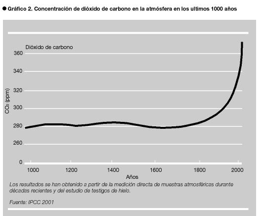 ¿A qué se debe este calentamiento? No está del todo claro, pero parece probable que no se deba a un solo factor, tanto natural como antropogénico. Los cambios en el clima se pueden dar por la variabilidad interna del sistema climático y por factores externos. La influencia de los factores externos se puede comparar utilizando el concepto de radiative forcing (energía radiante de un factor de cambio). Éste será positivo si provoca un calentamiento de la superficie de la Tierra, o negativo si provoca un enfriamiento. Los cambios en el incremento de la concentración de los gases de efecto invernadero, de la energía del Sol, el vulcanismo y la concentración de aerosoles atmosféricos afectan a la energía radiante, ya sea positiva o negativamente. Por ejemplo, la concentración de gases de efecto invernadero (véase la de dióxido de carbono en el gráfico 2) en la atmósfera de los últimos 1.000 años se ha incrementado en los últimos 200 años de forma similar a la de la temperatura del hemisferio norte (gráfico 1). Este incremento refleja el uso progresivo de combustibles fósiles en nuestra sociedad. Los gases de efecto invernadero tienen un efecto positivo en el incremento de la energía radiante. Por lo tanto, en los últimos 200 años podría haber aumentado de forma progresiva la capacidad de la atmósfera para absorber la energía del Sol, que puede haber llevado al calentamiento gradual de la superficie del planeta.