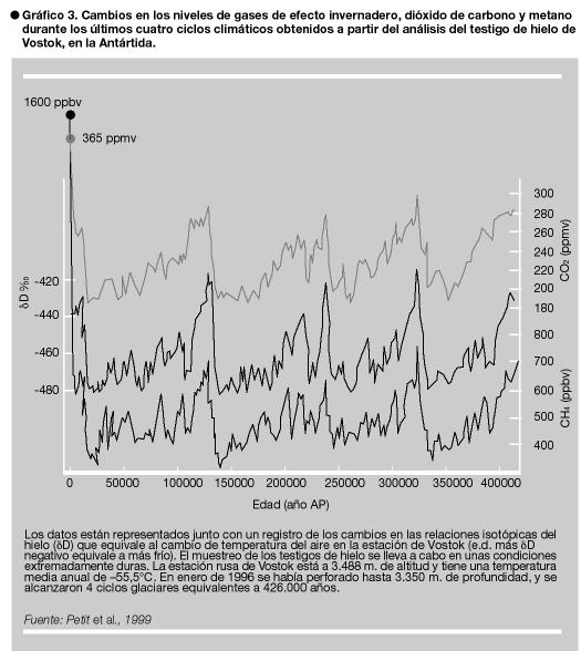 El estudio de los testigos de hielo en la Antártida y en Groenlandia, junto con el análisis detallado de sedimentos marinos y de lagos con tasas de acumulación de sedimentos elevadas, ha revolucionado nuestra forma de entender la evolución del clima. En primer lugar, por mostrar la estrecha relación que existe entre la abundancia de los gases de efecto invernadero y el clima en escalas de miles de años y, en segundo lugar, por revelar la frecuencia a la que se dan episodios de cambio climático abrupto en escalas inferiores a un siglo, tema que se discutirá en la siguiente sección. El hielo de los casquetes polares es, en efecto, la atmósfera congelada. En la Antártida hay restos de la atmósfera de casi el último medio millón de años. (gráfico 3; Petit et al., 1999). En Groenlandia, los testigos de hielo recuperados «sólo» abarcan los últimos 110.000 años. En parte, esto se debe a que nieva más, lo que hace que los registros de hielo de Groenlandia sean de más alta resolución y que incluso se pueda medir la variabilidad anual en la composición de la atmósfera. En el registro de la atmósfera de Vostok (en referencia a la estación rusa de donde se obtuvieron las muestras) en la Antártida, los valores más altos de gases de efecto invernadero (dióxido de carbono y metano) se encuentran durante los períodos interglaciares, y los más bajos, durante las glaciaciones (gráfico 3). La correlación entre los valores de metano y dióxido de carbono con las temperaturas sobre la Antártida (estimadas mediante la medida de las relaciones isotópicas del hidrógeno del hielo) sugiere un estrecho vínculo entre estos gases y el clima, y demuestran el dinamismo de los sumideros de carbono tanto oceánicos como continentales en respuesta a los cambios climáticos. Ahora bien, todavía no se entiende del todo cómo interaccionan los gases de efecto invernadero con el sistema climático. Las concentraciones de los gases aumentan miles de años antes de que los grandes casquetes polares de las épocas glaciares se deshielen total o parcialmente. Así, no está totalmente claro qué causa el paso de una época glaciar a una interglaciar y viceversa: si es el cambio en los gases de efecto invernadero, la insolación, o ambos. Sea cual sea el mecanismo iniciador, tampoco está claro qué es lo que hace que el metano y el dióxido de carbono fluctúen de una forma natural en escalas de miles de años. De todos modos, en el contexto actual del incremento de gases de efecto invernadero, queda de manifiesto, si se observa el gráfico 3, que las concentraciones actuales de dióxido de carbono son las más altas de los últimos 420.000 años y, por lo tanto, no poseen un precedente natural en todo este tiempo. La concentración de dióxido de carbono actual es de 365 ppm, mientras que las máximas de los últimos tres períodos interglaciares no han sobrepasado las 300 ppm, aunque normalmente los valores alcanzados en épocas análogas a la actual son de alrededor de 280 ppm, al igual que en las concentraciones preindustriales de este gas. Si continúa el ritmo actual de crecimiento del contenido de dióxido de carbono en la atmósfera, dentro de pocos años, el crecimiento de este gas, desde el siglo XIX, habrá sobrepasado con creces el incremento que se observa entre épocas glaciares (200 ppm) e interglaciares (280 ppm). En cuanto al metano, sus valores actuales (1.600 ppb) ya son más del doble de los valores normales de los períodos interglaciares (700 ppb), y su crecimiento desde la época preindustrial ha superado el doble (900 ppb) del crecimiento normal desde la máxima glaciar hasta la interglaciar (350 ppb). Así pues, aunque no se entiendan exactamente las consecuencias que de ello puedan derivar óo no se puedan demostraró, no es de extrañar que haya tanta gente preocupada en todo el mundo por los niveles crecientes de gases de efecto invernadero.