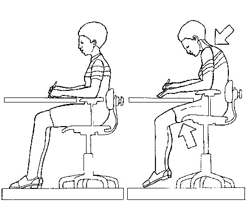 La posición correcta es aquella en que la persona está sentada recta frente al trabajo que tiene que realizar o cerca de él.