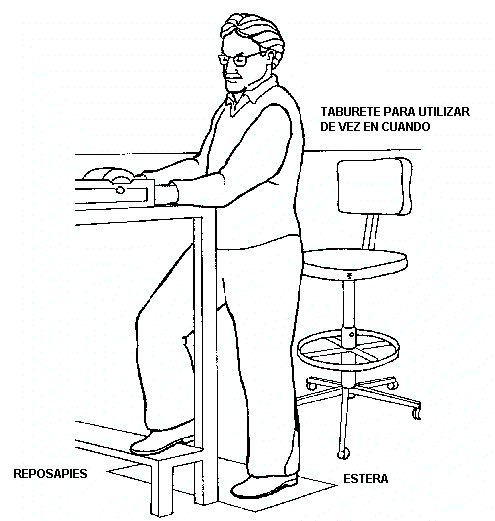 Se debe facilitar un escabel para ayudar a reducir la presión sobre la espalda y para que el trabajador pueda cambiar de postura. Trasladar peso de vez en cuando disminuye la presión sobre las piernas y la espalda.