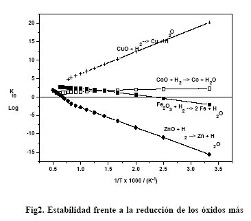 De acuerdo con la Fig 2 los óxidos CuO, CoO y Fe2O3 no son estables y el material situado en las capas altas del reactor de lecho fijo serían reducidos a estados de oxidación más bajos antes de que tenga lugar la sulfuración.