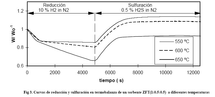 Como ejemplo, en la Figura 3 se muestran las correspondientes curvas de reducción y sulfuración del sorbente ZFT(1:0.5:0.5) a diferentes temperaturas.