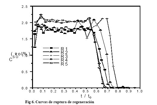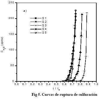 En la sulfuración (Fig 5) antes de la ruptura la concentración de H2S alcanza niveles casi indetectables mientras que en la ruptura las curvas se elevan casi verticalmente, es decir, en las condiciones ensayadas el sorbente presenta un comportamiento de sorbente casi ideal sin que se revelen efectos cinéticos.