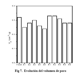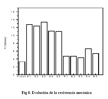 En las Figuras 7 y 8 se muestra la evolución de las propiedades texturales y de la resistencia mecánica de los extruidos en sucesivos ensayos multiciclo en donde se observa el progresivo decaimiento del comportamiento como consecuencia de la sinterización y el estrés térmico.