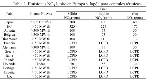 Es bien sabido que los NOx emitidos a la atmósfera pueden causar daños al ecosistema y son especialmente agresivos por su carácter ácido. La creciente contaminación de los NOx ha llevado a las naciones tecnológica e industrialmente más avanzadas a limitar sus emisiones. Esta legislación varia considerablemente de país en país. La Tabla 1 recoge los valores limite establecidos en Japón y en la Unión Europea, los cuáles dependen del tipo de combustible utilizado, del tamaño de la instalación emisora y si se trata de una planta existente o de nueva instalación [2].