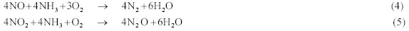 el amoníaco en forma de hidróxido amónico liquido, es vaporizado, diluido con aire e inyectado directamente en la corriente de gases a tratar a través de un distribuidor. En condiciones típicas del proceso SCR (exceso de NO, relación de entrada de NH3/NOx menor de la unidad, porcentaje de O2 entre 2-5 % vol., y temperaturas menores de 400ºC), la reacción (1) resulta predominante. Sin embargo también es posible la formación de óxido nitroso en el medio de reacción mediante las reacciones no deseadas (4-5), y además por otra parte, cuando el amoniaco reacciona con el oxigeno puede dar nitrógeno molecular, oxido nitroso, o bien óxido nítrico, según las siguientes reacciones, que se consideran asimismo reacciones secundarias indeseables (6-8) :