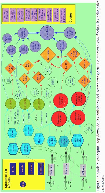 La Figura 1 muestra el diagrama conceptual completo del modelo de evaluación de las emisiones de carbono del sector transporte (ST). La Tabla 1 muestra la composición del parque automotor activo por tipo de vehículo y combustible. Existen en 2008 un total de 8,4 millones vehículos circulantes con una antigüedad media de 13,5 años. El 40% de los vehículos totales, aproximadamente 3 millones de unidades, son particulares nafteros o gasolina, mientras que el 20% de los vehículos particulares usan GNC. Los vehículos livianos diesel componen el otro 20% (1,7 millones). El 50% de la flota corresponde a vehículos de fabricación anterior al año 1994 y correspondientemente el 50% superior a vehículos posteriores a ese año. La Figura 2a muestra la tasa de motorización comparada con el PBI/cápita. Esta tasa pasó de 7,5 personas promedio por vehículos (o 13 vehículos cada 100 habitantes) en 1975 a menos de 5 (o casi 22 veh. cada 100 hab.) en 2008.