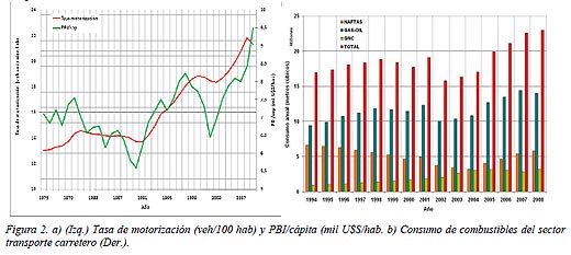 El consumo energético del ST pasó de 530 mil TJ en 1994 a 740 mil TJ en 2008. Entre 1994 y el año 2008, el PBI osciló entre 250 mil millones de USD (o 7500 USD per cápita anuales) y 335 mil millones USD en el año 2008 (o 8400 USD per cápita anuales); mientras que la población creció en el mismo período de 34,3 a 39,7 millones de habitantes (INDEC; WDI, 2010). Estos datos generales indican varias tendencias interesantes, por un lado el consumo de combustible de ST es un indicador de la evolución de la economía del país, ya que ciclos de retracción o expansión quedan reflejados con oscilaciones de hasta un 50%, especialmente para el consumo de naftas, más asociado al vehículo particular. En momentos de crisis se produjo una doble migración, por un lado una fuerte conversión del uso de naftas a GNC en vehículos usados y compra de vehículos nuevos diesel en los particulares. El consumo total de combustible sólo creció 125% en 15 años lo que da una media del 2% anual, con variaciones negativas de hasta un 20% anual. Comparativamente la población creció por debajo del 1,2 % medio anual. El PBI creció en el período 1994-2008 a una tasa de 2,4% anual media, con oscilaciones negativas de hasta 11% anual.