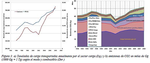 El sistema de carga por ferrocarril, ha crecido en forma constante de 12 millones de toneladas anuales transportadas y 6 mil millones de ton.km en 1994 a 26 millones de toneladas y 13 mil millones de ton.km en 2008 con una reducción importante entre los años 1997 al 2001 (Figura 3a). El sistema de camiones movilizó 306 millones de toneladas y 104 mil millones de ton.km en 1994, pasando a 750 millones de toneladas y 260 mil millones ton.km en 2008. Esto implica un promedio de 4% para el FFCC con un traslado medio de 510 km y 96% para camiones con un traslado medio de 350 km. Un 30% del material transportado corresponde a cereales, 50 % a material industrial y el resto es material minero y combustibles (STN, UTN, 2007b). Las emisiones de carbono en 2008 para FFCC promediaron 295 Gg y 25,45 Tg para los camiones (1 Tg = 1000 Gg = 1 millón de toneladas o 1012g). Las emisiones unitarias por unidad de carga por kilómetro transportado tienen un beneficio directo para el transporte de ferrocarril con un promedio de 25 g/ton.km transportado frente a 124 g/ton.km para los camiones en el período 1994-2008. Sin embargo la distribución espacial de la red de FFCC hace que sólo parcialmente se pueda realizar una sustitución modal de camiones a FFCC. Debe notarse que en Argentina el camión típico varía entre 12 a 17 toneladas de carga nominal, pero su carga habitual es muy inferior. La cantidad de pasajeros transportados en el área metropolitana de Buenos Aires, promedió entre 1994 y 2008 un total de 2150 millones de pasajeros, de los cuales 395 millones (18%) usaron el ferrocarril suburbano, 228 millones (11%) lo hicieron en subte y el resto 1535 millones (71%) usaron transporte colectivo automotor. Estas cifras no tienen en cuenta los pasajeros que usaron vehículos privados. El sistema de transporte público por colectivo moviliza anualmente en promedio para el período 1987-2008, 1700 millones de pasajeros con 12,200 millones de pas.km, 760 millones de kilómetros recorridos y una distancia media de 7,2 km por pasajeros. El sistema interurbano por colectivo, para el mismo período ha crecido de 45 millones a 65 millones de pasajeros transportados (media anual de 50 millones de pasajeros) con una distancia media de 302 km y 625 millones de kilómetros recorridos anuales y 25 pasajeros por coche.