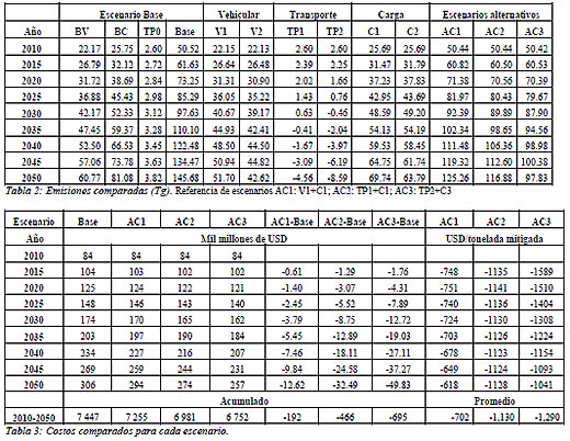 Para evaluar los escenarios de mitigación se definieron los siguientes estrategias: en el sector de carga se estudiaron dos alternativas, la primera es de trasladar parte del sector de carga de camiones a trenes (C1) y otra adicionando camiones bitrenes, especialmente para el traslado de material a granel (C2). En el sector automotor, se propuso una alternativa que incluye una tasa de conversión a GNC (V1) del 25% y otra del 50% (V2) incluyendo una reducción de la circulación de los vehículos con traspaso al transporte público. Actualmente la Argentina ha alcanzado un nivel del 20% de conversión., por lo que estos escenarios profundizarían esta tendencia. Los escenarios de transporte suponen un 20% (TP1) y 25% (TP2) de sustitución del vehículo particular por diversas combinaciones de subte, FFCC y ómnibus o BRT, partiendo de un uso vehicular actual de 2,5 pasajeros promedio por auto hasta reducirse a 1,1 pasajeros promedio por auto en 2050. Estas variantes se organizaron en tres opciones: a) Opción AC1 que incluye el escenario 1 de vehículos (V1), el escenario de transporte base (TP0) y el escenario 1 de Carga (C1); b) Opción AC2 que incluye el escenario 1 de Vehículos (V1), el escenario de Transporte (TP1) y el escenario 1 de Carga (C1), c) Opción AC3 que incluye el escenario 2 de Vehículos (V2), el escenario de Transporte (TP2) y el escenario 2 de Carga (C2). Para todos ellos se incluyó una mejora tecnológica gradual de reducción de las emisiones y eficiencia de consumo de combustible. En cada opción se han calculado los siguientes valores: costo de mantenimiento de carreteras para vehículos (Cv) : 0,15 U$S/veh.km; costo de mantenimiento de carreteras para camiones (Ct): 0,11 U$S/tn.km; costo de conversión de vehículos a GNC (Cc): 1000 U$S / veh.; costo de mantenimiento de FFCC (Cf): 0,09 U$S/tn.km; costo de ampliación de subtes o FFCC urbanos (Cs): 0,6 U$S/pas.km; costo de mejoras de sistema de micros o BRT (Cm): 0,3 U$S/pas.km; costo de la nafta o gasolina (Cn):1000 U$S /m3, o un equivalente a 0,22 U$S/km recorrido; costo de gas-oil (Cd): 750 U$S/m3, ó 0,05 U$S/ ton.km transportado; ó 0,018 U$S/pas.km transportado; costo de GNC (Cg): 0,4 U$S/m3, ó 0,011 U$S/km recorrido. Estos valores se tomaron de las licitaciones públicas recientes en materia de transporte (Dirección Nacional de Vialidad), informes sobre transporte de cargas y pasajeros de la UTN (2007a,b), organizaciones internacionales (EIA, 2010) y consulta a expertos en el área.