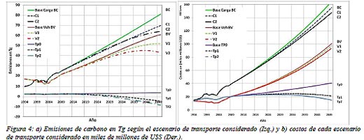 En el Escenario C1 de carga se supone el mismo nivel de cargas transportadas que en el escenario base, pero se sustituye parcialmente las cargas del modo camión al ferrocarril, alcanzando gradualmente del 5% hasta un 20% de las cargas transportadas, mientras que los camiones se reducen al 80% de las ton.km transportadas. Esto es, se traspasan gradualmente hasta 100 millones de toneladas. Se estima que en el año 2050 sobre 1200 millones de ton.km, 240 millones de ton.km se trasladan por FFCC y 960 millones de ton.km se realizan por camión. En el Escenario C2 se adiciona al Escenario 1 una sustitución de los camiones de 17 Ton por camiones de 47 Ton llamados rodotrenes o bitrenes. Se supone un reemplazo gradual de hasta 150 mil millones de ton.km para el 2050. Esto significa una partición del 20% para FFCC, 68% para camiones de 17 Ton y 12% para camiones de 47 Ton. Es decir, sobre 1200 millones de ton.km, 240 millones de ton.km se trasladan por FFCC y 810 millones de ton.km se realizan por camión y 150 millones de ton.km por rodotren. Para lograr una mayor participación del transporte ferroviario o de bitrenes debe tenerse en cuenta cambios en la logística de carga, que implica mejorar la relación peso / volumen transportado para cada tipo de carga. Los transportes a granel, de agricultura, minería o combustibles, lo que implica casi el 50% de las cargas en Argentina, puede ser factible de este transporte masivo, pero las cargas industriales se realizan con participación de camiones menores y a destinos muy variados, lo que demandaría, en caso de usos de FFCC, una expansión muy grande del trazado ferroviario. En cuanto a los bitrenes pueden circular en autopistas o en trazados propios, pero no pueden ingresar a la ciudad, lo que requiere de zonas de embarque y desembarque propios. Estos aspectos son muy importantes a la hora de proponer medidas de mitigación, que no necesariamente están asociadas a emisiones de carbono, sino al manejo y logística del sector carga. En el Escenario de Carga 1 las emisiones de CO2 evolucionan de 21,1 Tg actuales (2008) a 69,5 Tg en el año 2050, proviniendo 66,3 Tg de camiones y 3,2 Tg de FFCC.