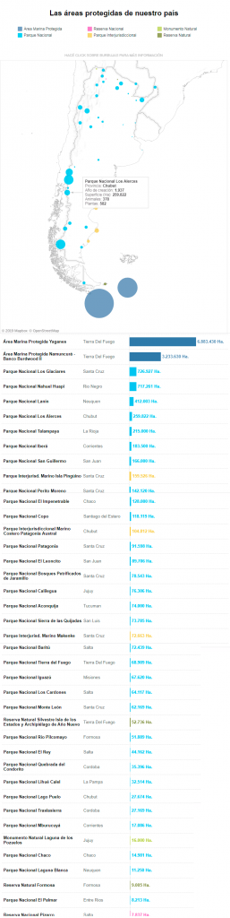 “Hemos ampliado la cobertura de los humedales en áreas de conservación mediante la creación del Parque Nacional Ciervo de los Pantanos y la Reserva Nacional Iberá. Al mismo tiempo, incrementamos el porcentaje de la superficie marina protegida de 2,6% en 2016 a 7,05% en 2018, mediante la creación de dos nuevas áreas marinas protegidas: Yaganes y Namuncurá-Banco Burdwood II. Esto ha significado un aumento de la superficie de las áreas naturales protegidas nacionales, que pasaron de 4.292.973 hectáreas en 2016 a 14.718.421 en 2018”, se lee en el informe.