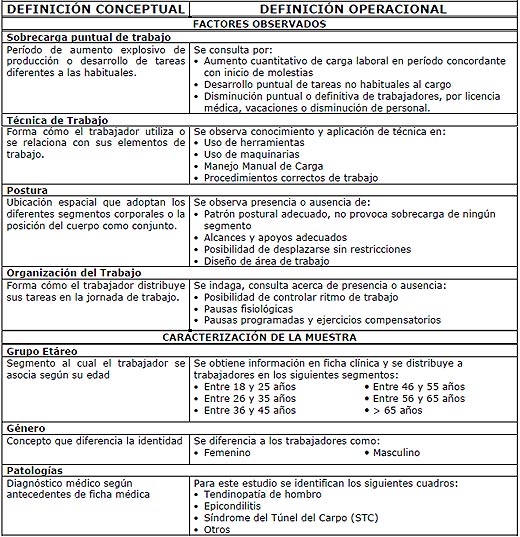 Se excluyen los cuadros de fibromialgia y quistes sinoviales. También se excluye para efectos de este estudio, los trabajadores que consultan por cuadros dorso lumbares y de extremidades inferiores.