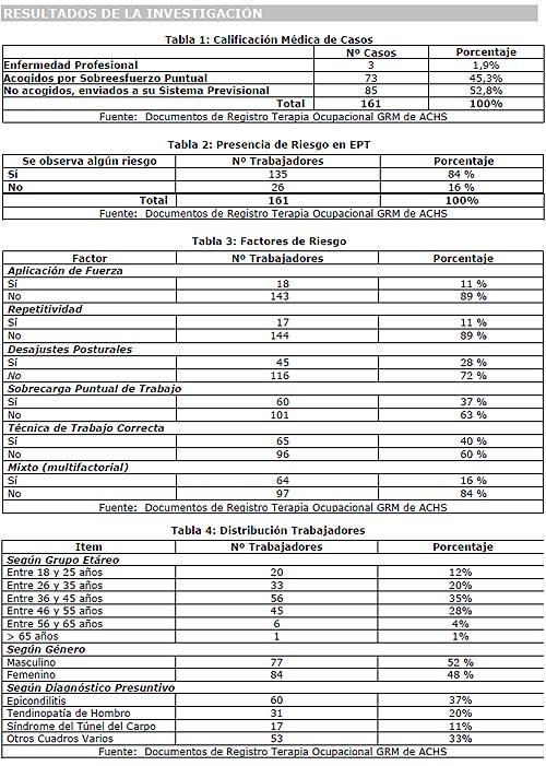 La población analizada es de 161 casos, correspondientes al 10% del total de trabajadores que acuden a la ACHS a consultar por dolor de extremidades superiores para atención el año 2008 y derivados por el médico tratante a Terapia Ocupacional para que se realice una EPT.