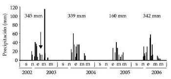 ![]() Figura 1. Precipitaciones caidas en el sitio experimental entre julio 2002 y junio 2006, en el sector cercano a la aguada del campo “La Dormida” (30.77º S, 60.80º W). Cada línea vertical representa un evento; valores en la parte superior: precipitaciones anuales totales (períodos julio-junio). Precipitación media anual: 320 mm (período 1986-2000, Agencia de Extensión Rural, INTA Portezuelo). La flecha señala la fecha de aplicación de los tratamientos. |