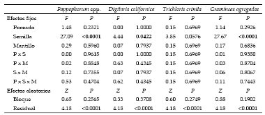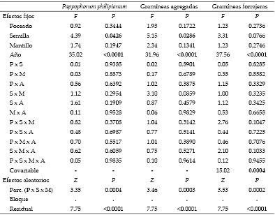 Tabla 2. Resultados del modelo mixto para densidad de plantas de Pappophorum philippianum, total de gramíneas agregadas y total de gramíneas forrajeras. Se muestran los valores de F y de probabilidad para los factores de efectos fijos (en negrita: P<0.05) y los valores de Z y de probabilidad para los factores de efectos aleatorios. Para densidad de plantas del total de gramíneas forrajeras se usó como covariable la densidad de dicho grupo medida antes del inicio del ensayo. |