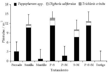 Sólo se observaron plántulas en junio de 2003, y todas correspondieron a las especies agregadas. Las parcelas con agregado de semillas mostraron mayor densidad total de plántulas que las parcelas sin agregado de semillas (Tabla 1; Figura 2). La mayor parte de esta diferencias estuvo asociada a la presencia de plántulas del género Pappophorum, seguida por Digitaria californica, y con un escaso aporte por Trichloris crinita (Tabla 1). Contrariamente a lo esperado, no se observó efecto significativo del poceado y de la aplicación de mantillo sobre la densidad de plántulas. Tampoco se observó interacción entre los factores semilla, poceado y mantillo (Tabla 1).