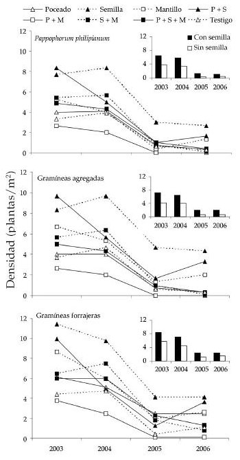Figura 3. Dinámica de la densidad promedio de plantas de Pappophorum philippianum (arriba), de especies de gramíneas agregadas (centro), y de especies de gramíneas forrajeras (abajo). Los EE de las medias fueron: 1.5 (arriba), 1.6 (centro) y 1.8 (abajo). Los valores de P figuran en la Tabla 2. Gráficos en parte superior derecha de cada figura: densidad promedio en parcelas con y sin agregado de semillas; EE: 0.7 (arriba), 0.8 (centro) y 0.9 (abajo). |