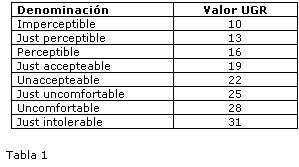 La evaluación del deslumbramiento molesto se realiza mediante el índice UGR (Unified Glare Rating) de la Commission Internationale de l’Éclariage (CIE). El índice UGR y sus métodos de cálculo se describen en la publicación CIE nº117-1995:”Discomfort Glare in interior lighting”. En la tabla 1 se muestra la escala UGR que cuantifica el deslumbramiento molesto.