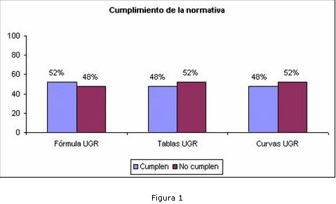 La evaluación del índice UGR ha sido evaluada a partir de los tres métodos descritos dentro de la publicación CIE. El valor del cumplimiento normativo según el método de la fórmula UGR se sitúa en el 52%, mientras que para los métodos de las tablas UGR y las curvas UGR el cumplimiento es del 48% de las instalaciones visitadas. Este hecho se refleja en la figura 1.