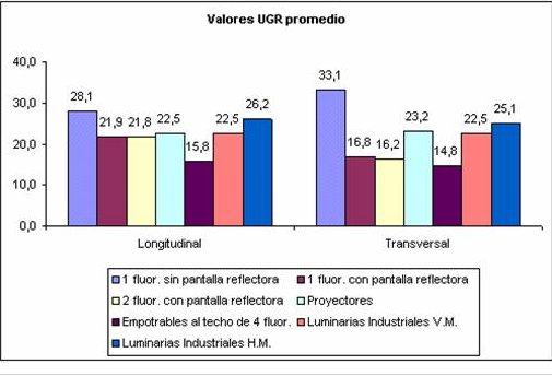 El análisis de la publicación CIE nº117-1995 revela que el principal factor que influye en el nivel de deslumbramiento molesto existente dependerá de la distribución de la intensidad luminosa que realiza la luminaria y, en definitiva, del tipo de luminaria. En la figura 2 se muestran los valores UGR medios, para dos líneas de visión, para las diferentes configuraciones del conjunto lámpara – luminaria que se han encontrado durante la realización del estudio.