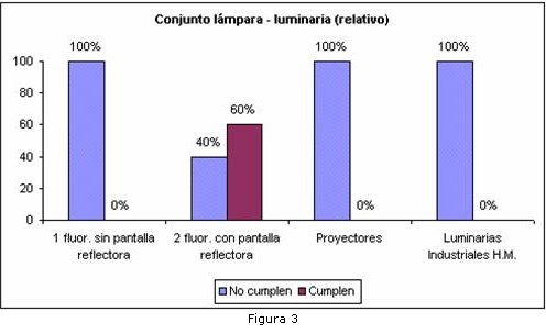 Es interesante conocer que tipo de instalaciones son más propensas a incumplir normativo. Un análisis de los resultados da origen a la figura 3, donde se muestran las 4 configuraciones de lámpara – luminaria que en alguna instalación no cumplen la normativa. Resulta interesante destacar que en el caso de luminarias con fluorescente descubierto, proyectores provistos de lámparas de halogenuros metálicos y luminarias industriales de halogenuros metálicos, el 100% de estas instalaciones no cumplen la normativa.