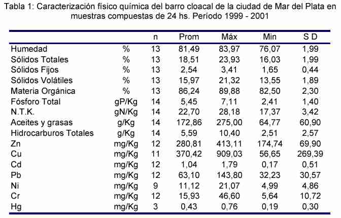 Mar del Plata posee un sistema de alcantarillado que permite la recolección conjunta de los efluentes cloacales e industriales. Este consta de redes cloacales y de cuatro colectoras máximas que transportan los efluentes del 85,2 % de la ciudad a la Planta de Pretratamiento de Efluentes Cloacales “Ingeniero Baltar” ubicada 10 Km. al norte del centro de la ciudad. Asimismo son vertidos en la Planta, efluentes transportados por camiones atmosféricos (67000 m 3 anuales), provenientes de pozos ciegos y de residuos de sistemas de tratamiento primario industriales. El pretratamiento consiste en separación de sólidos mediante cribas de 0.5 mm y deshidratación de los barros retenidos por compactación, generando 20-25 toneladas diarias de barros primarios que son transportados a un vivero para su estabilización natural. La caracterización físico química del barro primario se presenta en la Tabla 1, (2).