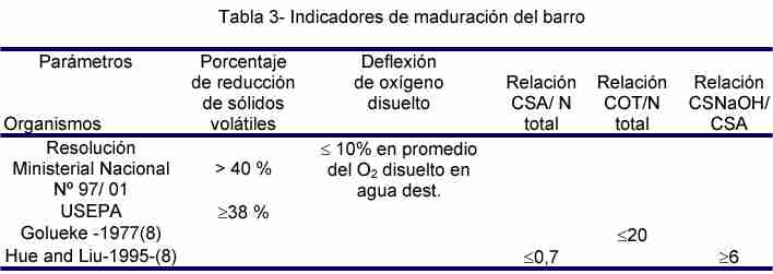 de madurez: que se confirma cuando el carbono no es más hidrolizable. Los parámetros que brindan esta información varían según los criterios adoptados por Organismos de aplicación y/o investigaciones específicas ; algunos de ellos se detallan en la Tabla 3: