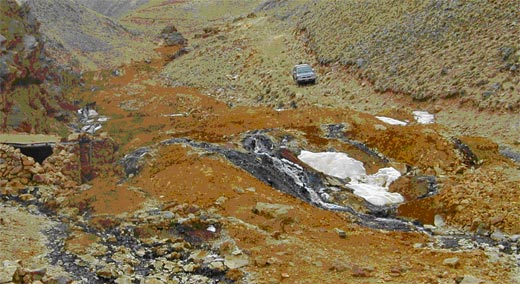 Los oxidados recién formados tienden a ser amarillos (obsérvese que impregnan el relleno de ladera hasta una cota mas alta que donde está la camioneta) , pero a medida que “envejecen” tienden a tomar color marrón-rojizo, fenómeno conocido por los geólogos como “viraje al rojo de las limonitas”.