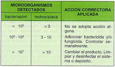 Otros parámetros complementarios a controlar inicialmente con periodicidad mensual en taladrinas en uso son: pH, concentración de producto y población microbiana. Conviene señalar que los parámetros considerados no se controlan en calidad de factores de riesgo para la salud de los usuarios o el medio ambiente, sino con el fin de obtener una información adicional de notable interés, ya que la práctica habitual hace pensar en la existencia de una posible relación entre los tres factores. Así, en determinadas circunstancias y especialmente en taladrinas semisintéticas y emulsiones, una disminución significativa de la concentración suele favorecer el crecimiento de la población microbiana, lo que facilita la reducción del pH y la degradación del producto. En los sistemas y depósitos de taladrinas que poseen buena aireación existe un predominio de microorganismos aerobios del género Pseudomonas, principales responsables de su degradación, así como coliformes. Por el contrario, en los sistemas mal aireados suelen aparecer organismos anaerobios estrictos del género Desulfovibrio, que reducen los sulfatos asulfuro de hidrógeno, originando olores desagradables. También aparecen, con cierta frecuencia, hongos y levaduras de los géneros Fusarium, Cefalosporium y Cándida (11).