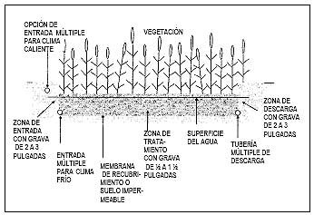 La vegetación emergente más comúnmente utilizada en humedales FS incluye las espadañas y aneas (Typha spp.), los juncos (Scirpus spp.) y los carrizos (Phragmites spp.). En Europa los Phragmites son las plantas preferidas para esta aplicación. Esta planta tiene varias ventajas debido a que se trata de una planta durable de rápido crecimiento que no es una fuente alimenticia para aves o la vida silvestre. Sin embargo, en algunas partes de los Estados Unidos el uso de Phragmites no está permitido porque esta es una planta de crecimiento agresivo, por lo cual se tiene la preocupación de que infeste humedales naturales. En estos casos los espadaña y los juncos pueden ser utilizados. La experiencia ha demostrado que en áreas donde se encuentra el ratón almizclero (muskrat) o las nutrias, estos pueden destruir completamente las espadañas, eneas y juncos plantados en un humedal artificial, al utilizar las plantas para alimento y anidación. Muchos de los sistemas individuales de menor tamaño usan plantas decorativas tolerantes a la humedad. La vegetación en un humedal FS no es un factor significativo en la remoción de nutrientes y no se requiere su poda. En climas fríos, la acumulación de detritos vegetales sobre el lecho de grava proporciona un aislamiento térmico que es útil durante los meses de invierno. Las raíces de las plantas sumergidas proporcionan sustrato para los procesos microbiológicos y dado que la mayoría de las macrófitas emergentes pueden transmitir oxígeno de las hojas a las raíces, se presentan microzonas aeróbicas en la superficie de las raíces y los rizomas. El resto del medio sumergido de los humedales FS tienden a carecer de oxígeno. Esta falta general de oxígeno limita la remoción biológica del amoniaco (NH3/NH4 – N) por nitrificación en los humedales FS, pero aún así el sistema es efectivo en la remoción de DBO, SST, metales y algunos contaminantes orgánicos prioritarios, dado que su tratamiento puede ocurrir bajo condiciones aeróbicas y anóxicas. La remoción de nitratos por desnitrificación biológica también puede ser muy efectiva dado que las condiciones anóxicas requeridas están siempre presentes y se cuenta con suficientes fuentes de carbono. La disponibilidad limitada de oxígeno en los humedales FS disminuye la capacidad de remoción de amoniaco por nitrificación biológica. Por esta razón se requieren tiempos largos de retención en un área extensa de humedal para producir los niveles bajos de nitrógeno en el efluente con la calidad típica de afluentes de agua residual doméstica a menos que se adopten algunas modificaciones del sistema. Estos cambios han incluido la instalación de tuberías de aireación en el fondo del lecho del sistema para oxigenación mecánica, el uso de un filtro percolador integrado para la nitrificación del amoníaco en el agua residual, y lechos de humedales de flujo vertical. Estos humedales de flujo vertical normalmente contienen grava o arena gruesa y reciben cargas intermitentes desde la superficie. La aplicación intermitente del agua residual y el drenaje vertical en el lecho permiten que las reacciones aeróbicas se produzcan con rapidez. El llenado y drenado cíclico de sistemas de flujo horizontal ha sido demostrado con éxito en el sistema de humedales FS de 130,000 galones por día de Minoa, New York. Las tasas de reacción para remoción de DBO5 y amoníaco fueron el doble de las observadas durante el flujo normal continuo de saturación.