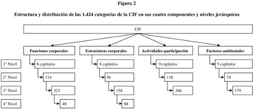 Desde la visión integral de este modelo, el nivel personal de funcionamiento es algo complejo con múltiples determinantes e interacciones que ejercen sus efectos a múltiples niveles e incluyen diferentes dimensiones7. Los componentes de las funciones y estructuras corporales, las actividades, la participación y los factores ambientales están clasificados en la CIF mediante categorías. Sólo los factores personales permanecen, por el momento, sin clasificar. Es de esperar que en los próximos años los esfuerzos de la FDRG culminen en el desarrollo de una clasificación de factores personales -estudiando la posibilidad y la metodología necesaria-. Hoy por hoy la CIF consta de 1.424 categorías mutuamente excluyentes que tomadas en conjunto cubren un espectro exhaustivo e integral de la experiencia humana y que están organizadas como una estructura jerárquica de 4 niveles diferenciados de menor a mayor precisión. (figura 2).