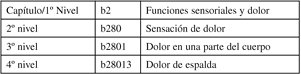 Según esta estructura jerárquica la categoría de nivel más alto (4o) comparte los atributos de la categoría de menor nivel (1o) a la cual pertenece. Así, en nuestro ejemplo, el uso de una categoría de más nivel (b28013, Dolor de espalda) implica automáticamente que es aplicable a una categoría de nivel inferior (b2801, Dolor en una parte del cuerpo).