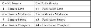 Por su parte, los factores ambientales son cuantificados con una escala negativa o positiva que indica la medida en la cual un factor ambiental actúa como barrera o facilitador1: