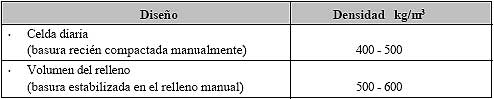 Densidad de diseño de la celda diaria y del relleno sanitario manual