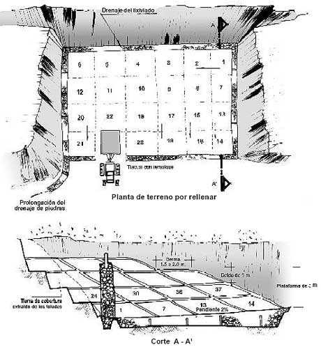 El método constructivo de un relleno sanitario manual depende principalmente de la topografía del sitio, aunque también está condicionado por el tipo de suelo y la profundidad del nivel freático.