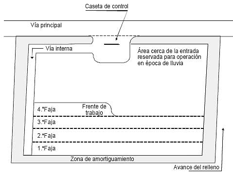 Para planificar la construcción y el avance del relleno sanitario es conveniente contar con una serie de planos, a saber: el del diseño del proyecto, el de la planta general de localización de las obras, el de las modificaciones del terreno (configuración inicial del sitio) y el de los detalles de las obras de infraestructura. También se requieren los de la planta y los perfiles de las zanjas o terraplenes, que indican la forma de excavación de las primeras y la configuración del relleno de las segundas; estos permitirán orientar las configuraciones parcial y final de la obra. Todos estos planos indican la forma de programar el frente de trabajo y su avance, calculando los volúmenes ocupados y las alturas de acuerdo con el diseño.
