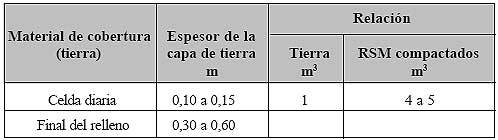 Para concluir la celda, se cubre con una capa de tierra de 0,10 a 0,15 metros, se esparce con ayuda de carretillas de mano, palas y azadón y se compacta con un rodillo y pisones de mano, siguiendo el mismo procedimiento efectuado con la basura. La cobertura diaria controla la presencia de insectos, roedores y aves, así como las quemas, el humo, los malos olores, el ingreso de agua y la basura dispersa. El cubrimiento deberá realizarse todos los días al final de la jornada, después del ingreso de residuos. Al cabo, no deberán quedar RSM al descubierto y menos para el fin de semana.