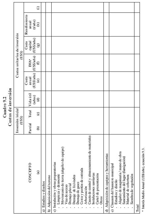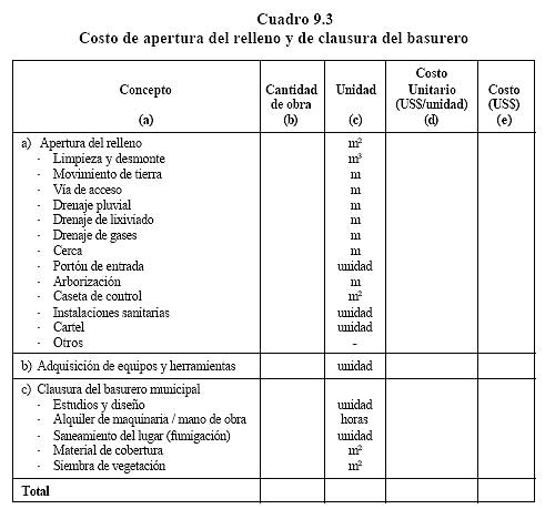 Finalmente, en la columna (e) del cuadro 9.2 se coloca el costo de cada componente, que es igual al producto de las columnas (b) y (d). Los costos obtenidos se colocan en la columna (b) del cuadro 9.1. - Clausura del botadero. Cerrar un botadero a cielo abierto es relativamente fácil si se cuenta con la maquinaria y el material de cobertura necesarios. Sin embargo, para estimar las cantidades de obra y evitar daños al ambiente o riesgos a la salud, es indispensable hacer un plan que incluya el uso posterior del sitio. Para tal efecto, también habría que emplear el cuadro 9.2 y, si es preciso, agregarle algunos conceptos.
