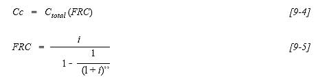 Con la suma de las columnas (e) y (f) se obtiene la columna (g), o sea, el costo anual del capital. Este también puede ser calculado directamente a partir del costo total (d) y usando las tablas o las fórmulas de recuperación del capital. En los libros de ingeniería económica hay tablas que dan el factor de recuperación del capital (FRC), en función del interés anual y de la vida útil. También es posible calcularlo con las fórmulas: