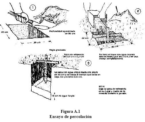 Mientras más poroso sea el suelo, mayor será el riesgo de infiltración del lixiviado y la posible contaminación del agua subterránea. Los terrenos formados por poros grandes no son efectivos para retener las partículas pequeñas y los formados por poros muy pequeños prácticamente son impermeables. A fin de determinar el área necesaria para los sistemas de tratamiento, se deberá hacer el siguiente ensayo (figura A.1).