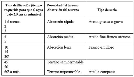 b Si la tasa de filtración es mayor de 60 min/2,5 cm, el terreno es inapropiado para tratamientos que utilicen el suelo como medio de absorción. Terreno apropiado para la disposición de residuos sólidos en un relleno sanitario.