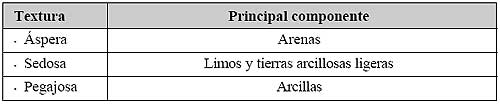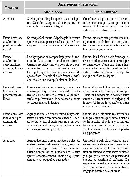La textura del suelo se determina en el campo, pasando y aplastando entre los dedos pulgar e índice una muestra húmeda del terreno. La textura del suelo depende de su composición principal y puede ser: