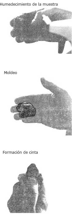 Si la muestra se humedece mucho, el material será muy pegajoso y difícil de trabajar. Una vez que la muestra esté húmeda, se debe empezar a aplastar y a pasar entre los dedos de manera que se vaya formando una cinta (figura B.1).
