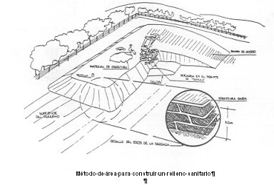 En áreas relativamente planas, donde no sea factible excavar fosas o trincheras para enterrar las basuras, éstas pueden depositarse directamente sobre el suelo original, elevando el nivel algunos metros. En estos casos, el material de cobertura deberá ser importado de otros sitios o, de ser posible, extraído de la capa superficial. En ambas condiciones, las primeras se construyen estableciendo una pendiente suave para evitar deslizamientos y lograr una mayor estabilidad a medida que se eleva el relleno. Figura 2.2.